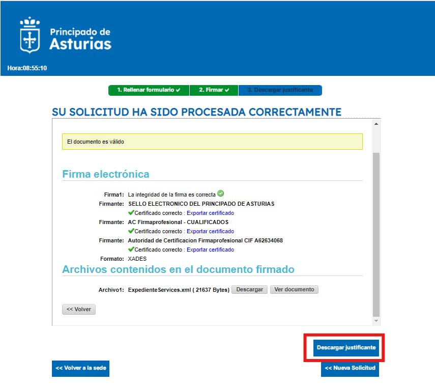 Una vez se haya procesado la solicitud podemos acceder a descargar el justificante de nuestro trámite.