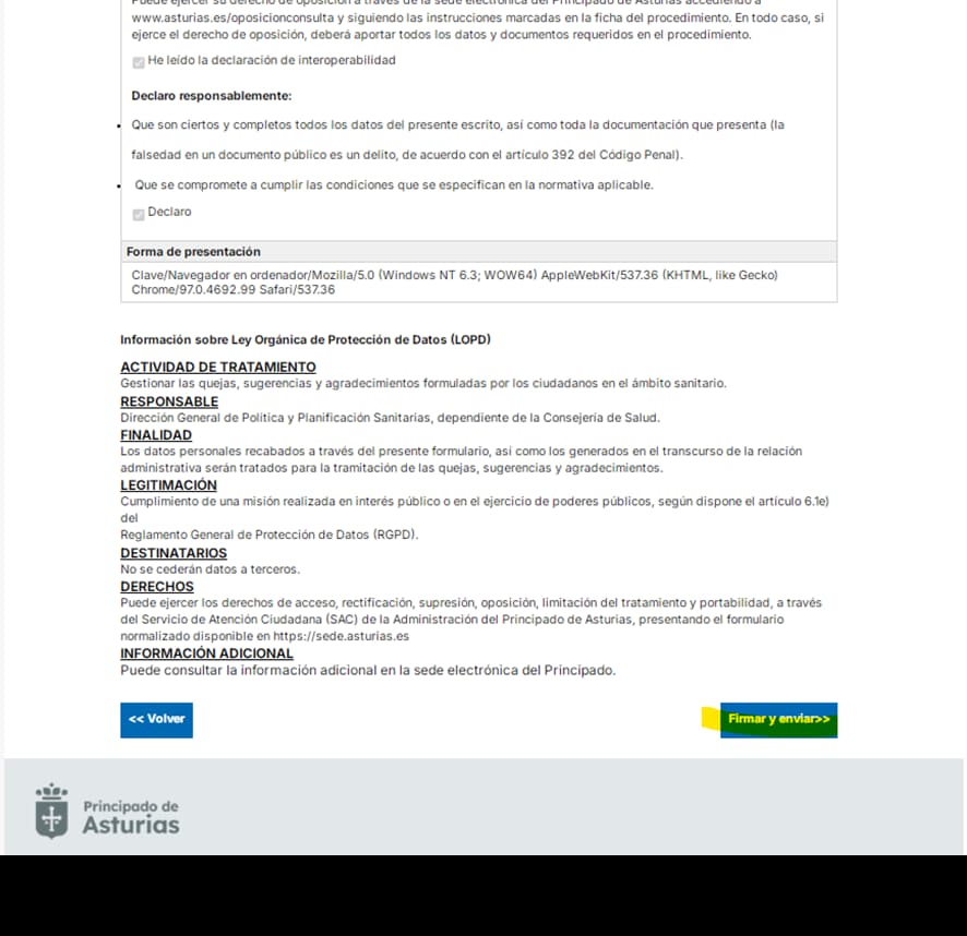 Se accederá al apartado final para revisar todos los datos de la solicitud y, si estamos conformes, proceder a la firma en el botón de “Firmar y enviar”.