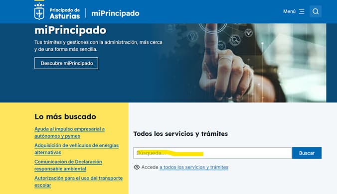 En primer lugar, accedemos a la página de miPrincipado desde la que podemos encontrar todos los trámites a realizar y, en el espacio de búsqueda indicamos aquel que nos interesa llevar a cabo.