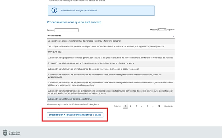 El paso anterior nos redirige a la sede electrónica, al apartado de “suscripciones”. En la esquina inferior izquierda daremos a “suscripción a nuevos consentimientos y bajas”